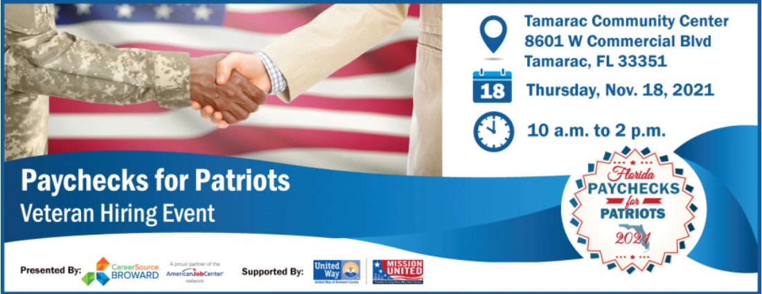 CareerSource Broward will host the ninth annual Paychecks for Patriots Hiring Event on Thursday, November 18, 2021, at the Tamarac Community Center. This free hiring event connects veterans and military families with great employers and careers in our local community. Hosted in partnership with the Florida Department of Economic Opportunity (DEO) and United Way MISSION UNITED, this event brings together “veteran-friendly” employers offering career opportunities in Broward County and looking to hire veteran and military family candidates. The event's first two hours (10 a.m. to noon) will be dedicated only to veterans, military spouses and eligible caregivers and will be open to the general public afterward.