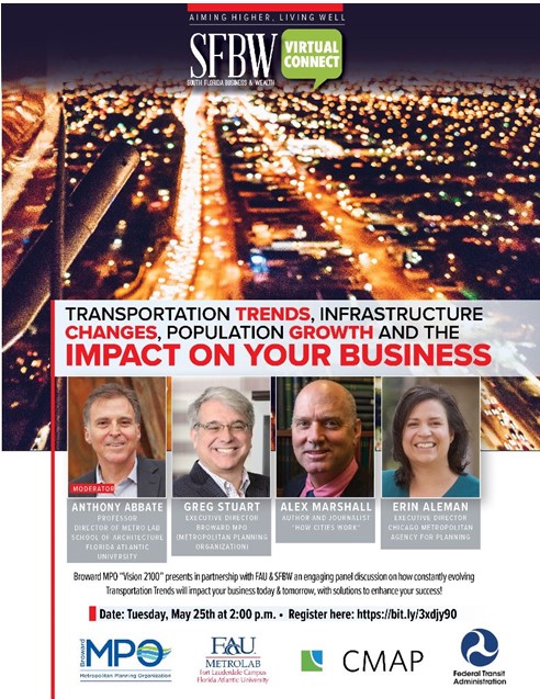 Broward MPO “Vision 2100” presents in partnership with FAU & SFBW an engaging panel discussion on how constantly evolving Transportation Trends will impact your business today & tomorrow, with solutions to enhance your success!